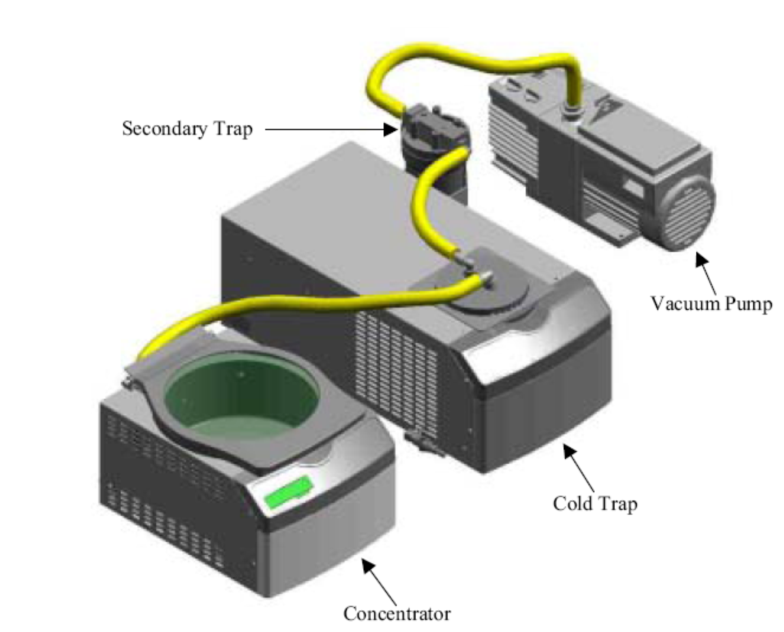 安排好組件的位置后,使用提供的真空管把系統連接在一起。用0.5’的真空管連接離心濃縮儀的后部排氣輸出,另一端連接冷阱蓋上的一個接頭上。取另一根管冷阱蓋上的另一接頭。另一端連接The Secondary Trap上的“OUT”接頭。取另一根真空管從“The Secondary Trap”連接到真空泵的輸入端,并用卡箍把這些連接處緊固。